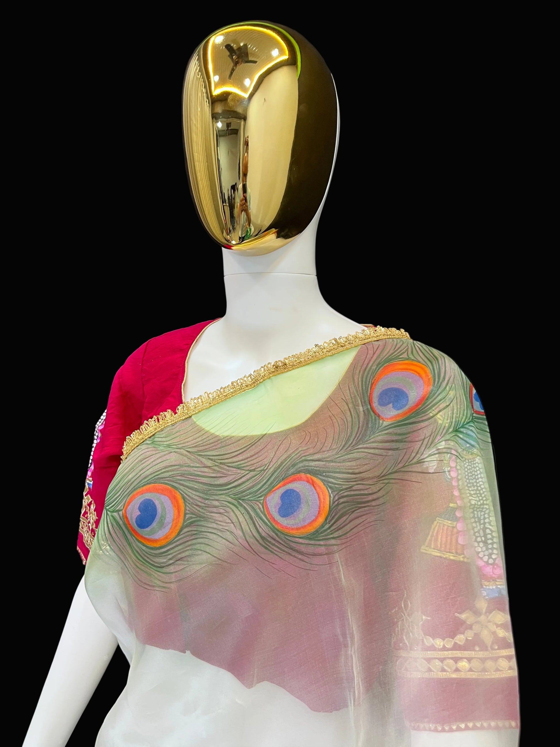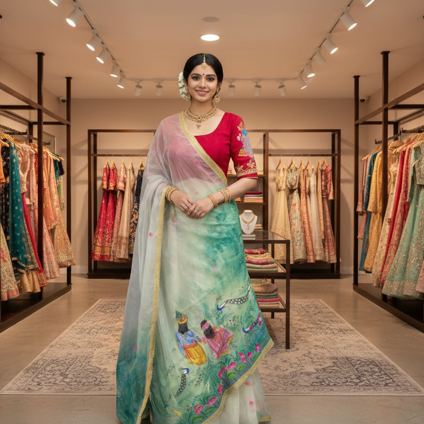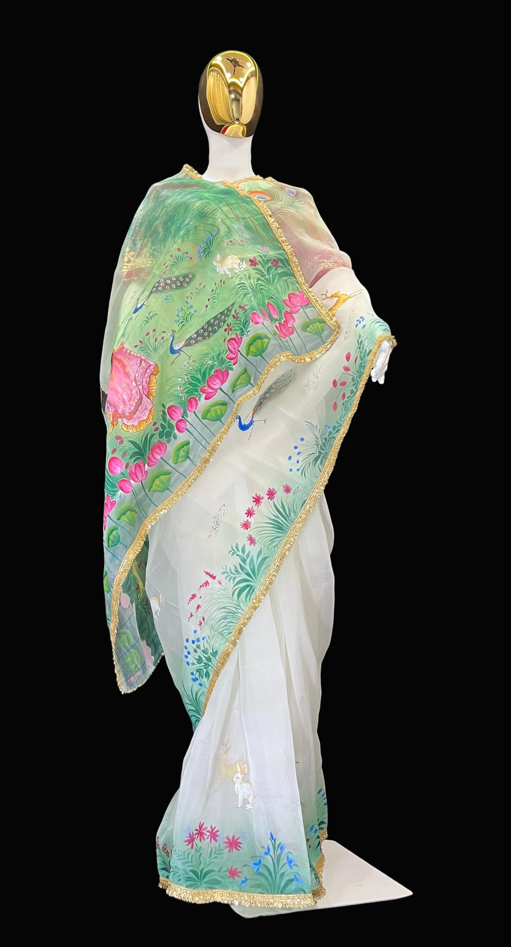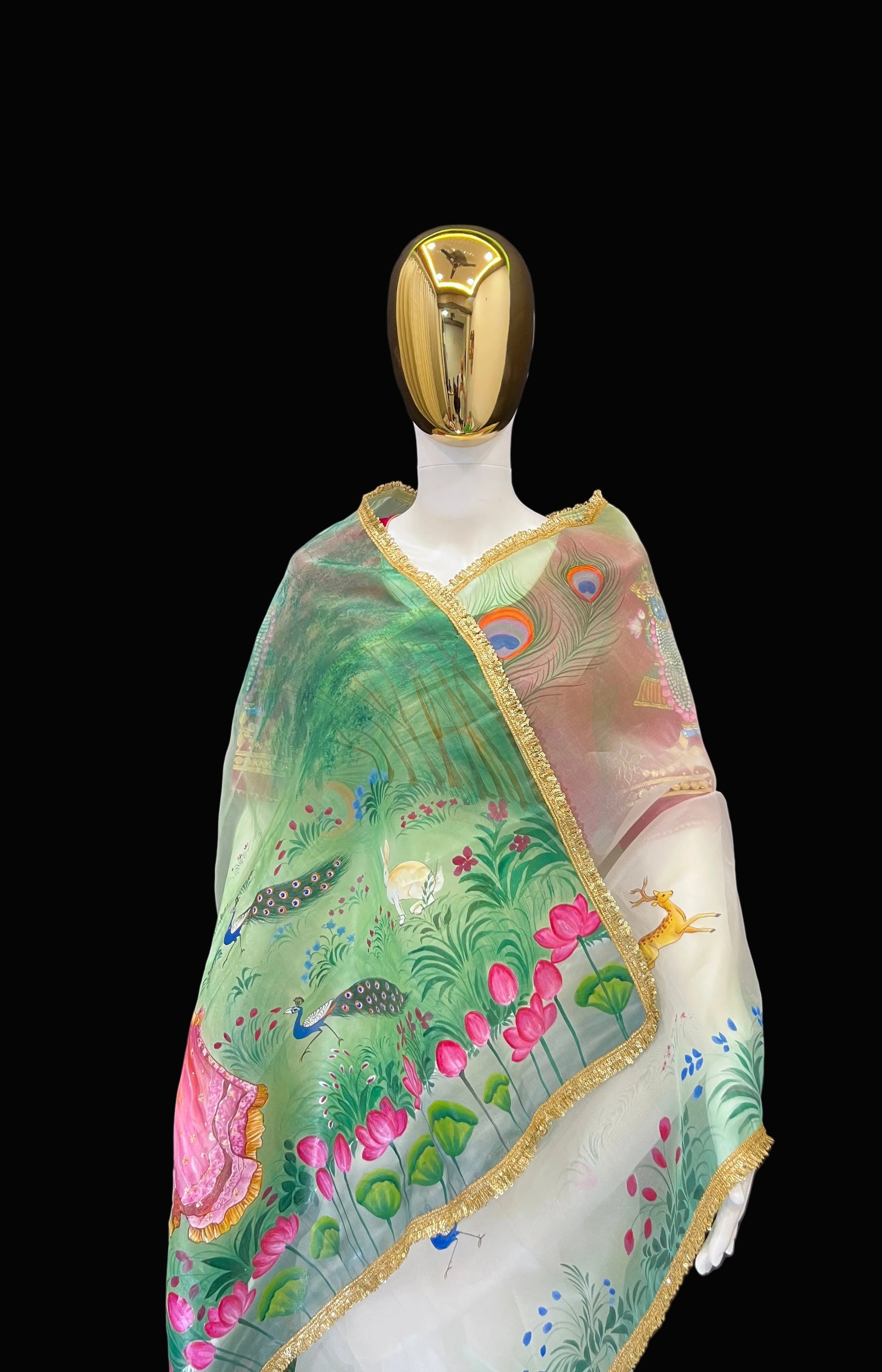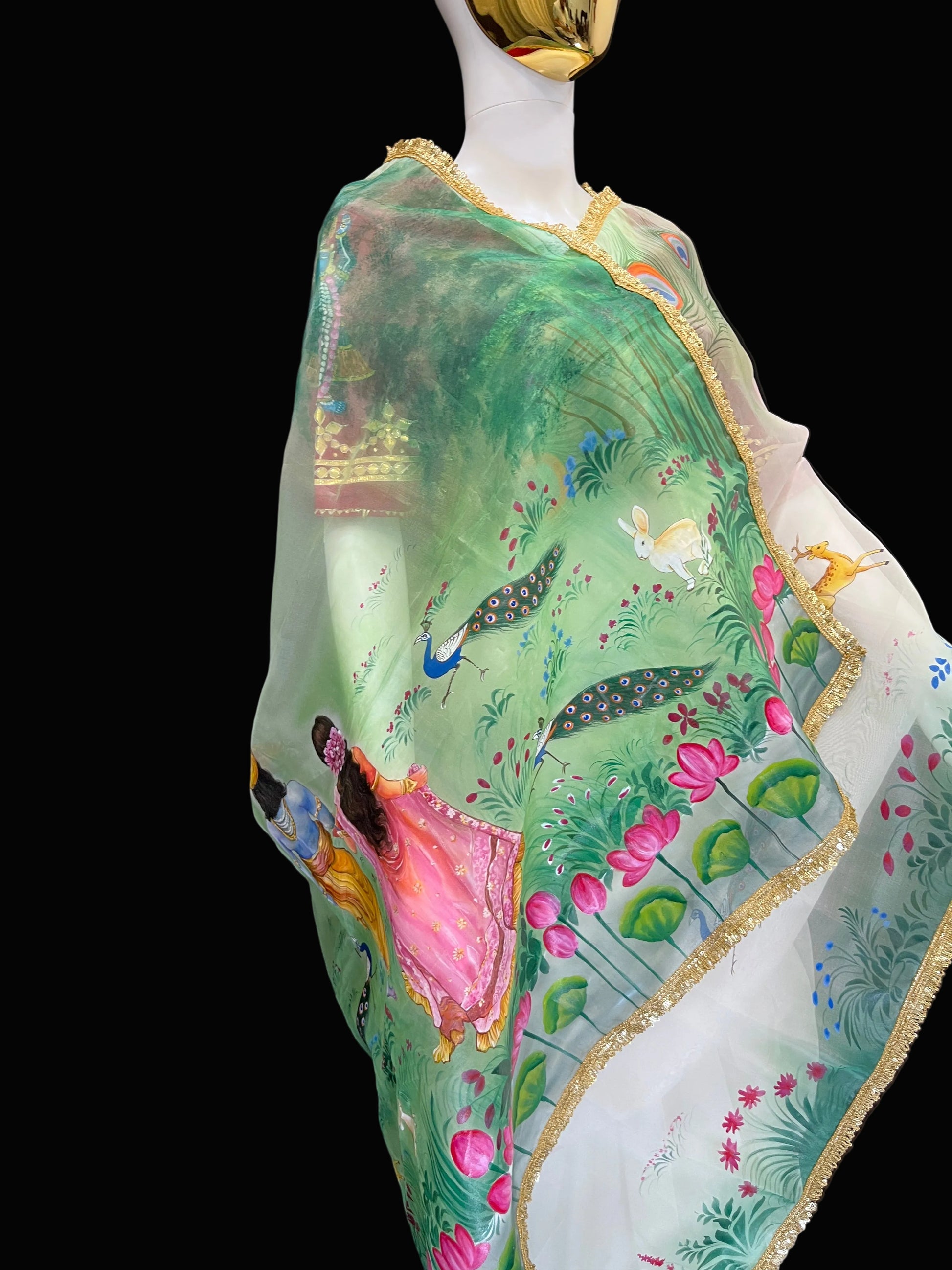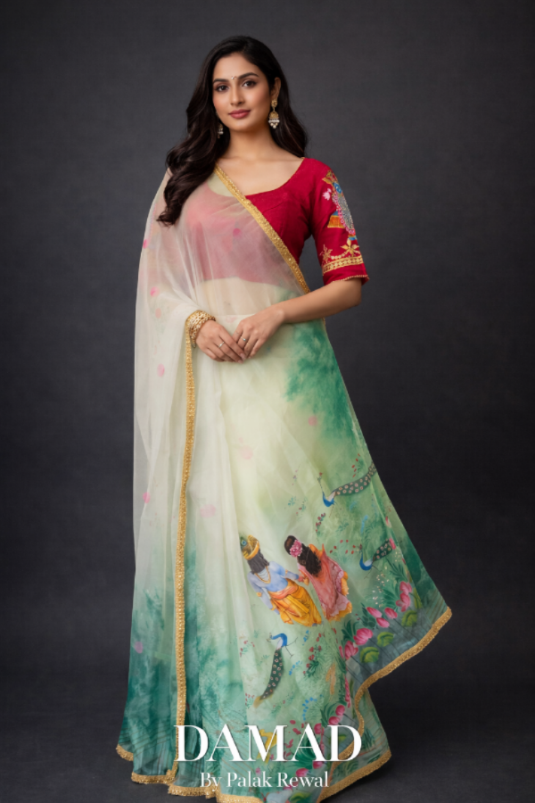 This saree is a unique blend of Krishnagar's Pichwai and modern art. A renowned artist from Kishangarh, Rajasthan, has beautifully depicted Radha and Krishna strolling in a forest on this saree. The entire saree is adorned with peacock feathers, and dancing peacocks in the forest further enhance its beauty. This saree is made of pure organza fabric, and dye paints have been used to create the design.