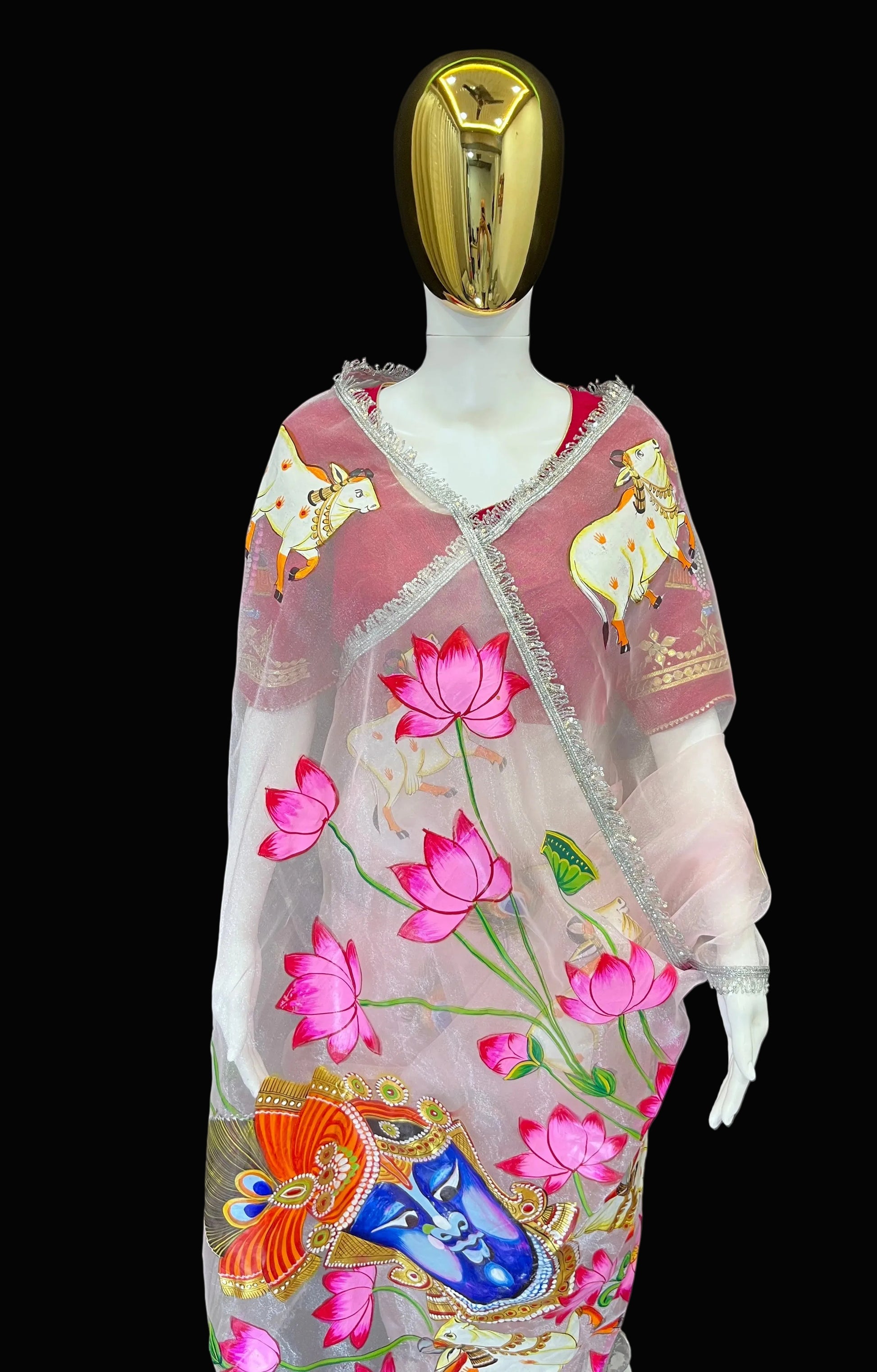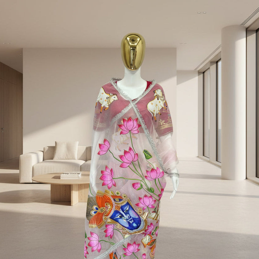 This saree showcases the Pichwai art of Kishangarh in a unique way. A renowned artist from Kishangarh, Rajasthan, has beautifully depicted the artwork of Shri Nath Ji on this saree. Fabric paints have been used to create this design.