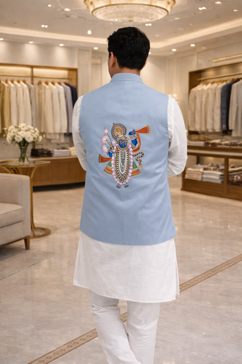 Crafted in a soothing pastel tone, the jacket features meticulously hand-painted Shrinath Ji on the back, rendered with exceptional detail and reverence. Each brushstroke is done by skilled artisans, making every piece truly one of a kind. The back artwork draws inspiration from traditional Pichwai paintings, reflecting the spiritual aura and grandeur of Nathdwara temple art.