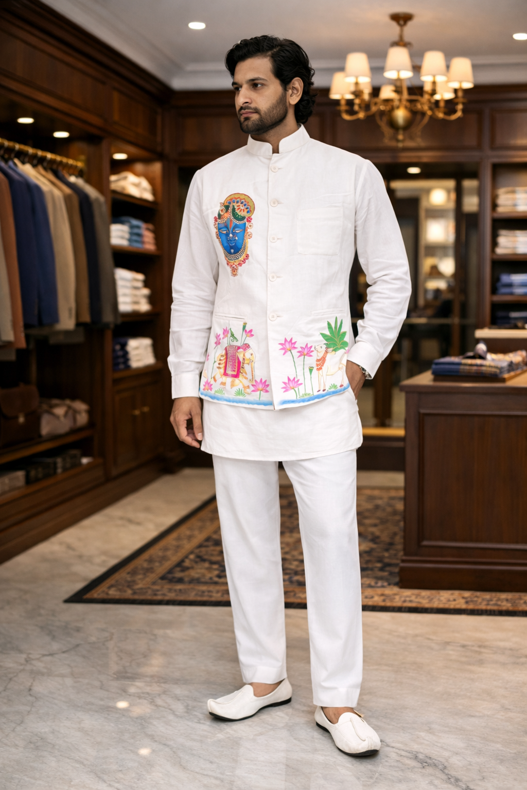 This exclusive Shrinath Ji Pichwai Art Nehru Jacket is handcrafted for those who appreciate art, devotion, and luxury.